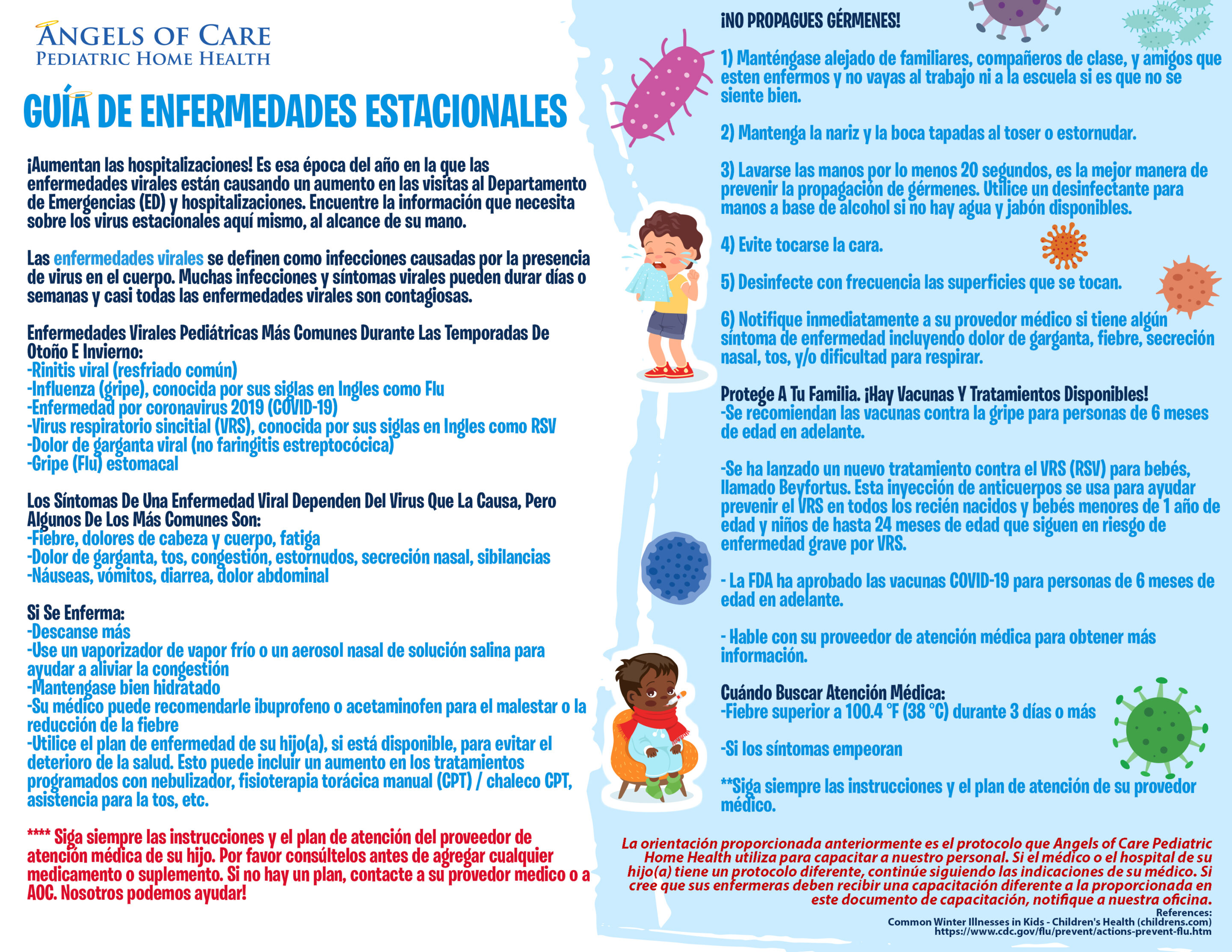 ¡Los casos de gripe (Flu), COVID-19 y Virus Respiratorio Sincitial (RSV) están en aumento! Proteja a su hijo(a) haciendo del lavado de manos la primera línea de defensa, manténgase al día con las vacunas recomendadas. Consulte los folletos adjuntos para obtener consejos sobre la prevención de enfermedades. Mascarillas están disponibles a solicitud. Si necesita apoyo adicional, comuníquese con su sucursal local y solicite hablar con su Administrador de Atención Clínica (CCM). ¡Estamos aquí para ayudarle!