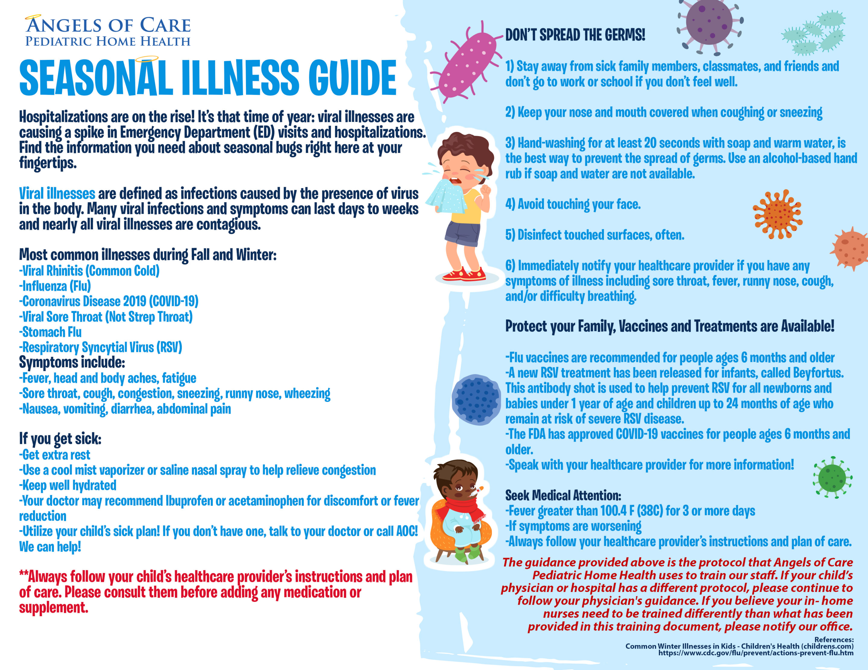 Flu, COVID-19, and RSV cases are on the rise! Protect your child by making handwashing the first line of defense, stay up to date on recommended vaccines. See attached flyers for illness prevention tips. Facemasks are available upon request. If you need extra support, contact your local branch and ask to speak with your Clinical Care Manager (CCM)—we’re happy to help!